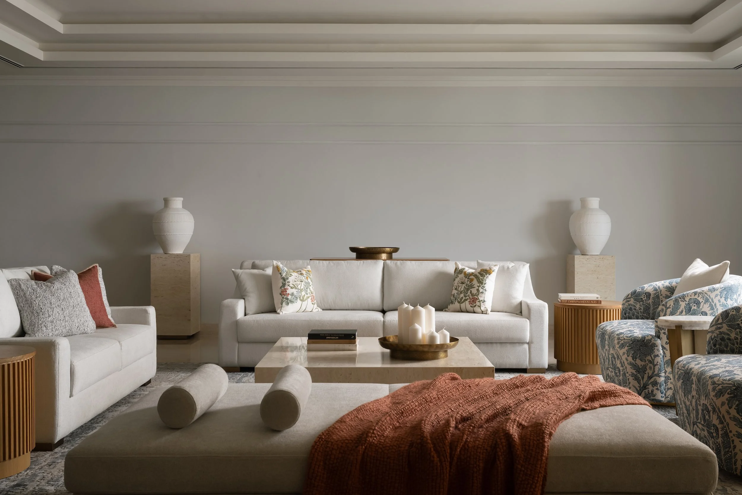 Perched on an upper floor of a Bengaluru high-rise, House in the Sky by Aakriti Saraf Design is designed for a close-knit family where three generations come together. The home balances a seamless, symmetrical design language with moments of joyful expression - blue, red, green, and yellow appear as considered accents across wallpapers, furnishings, and art. A beautiful beige marble floor with warm brown undertones flows continuously through the spaces, echoing the oak woodwork to create a cohesive, understated canvas.